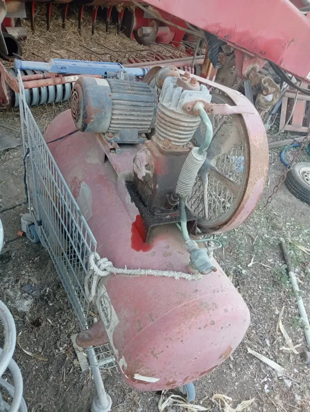 Compresor monofásico de estilo antiguo, con un diseño robusto y funcional. - Tanque de aire de gran capacidad. - Motor eléctrico. - Ruedas para facilitar el transporte.