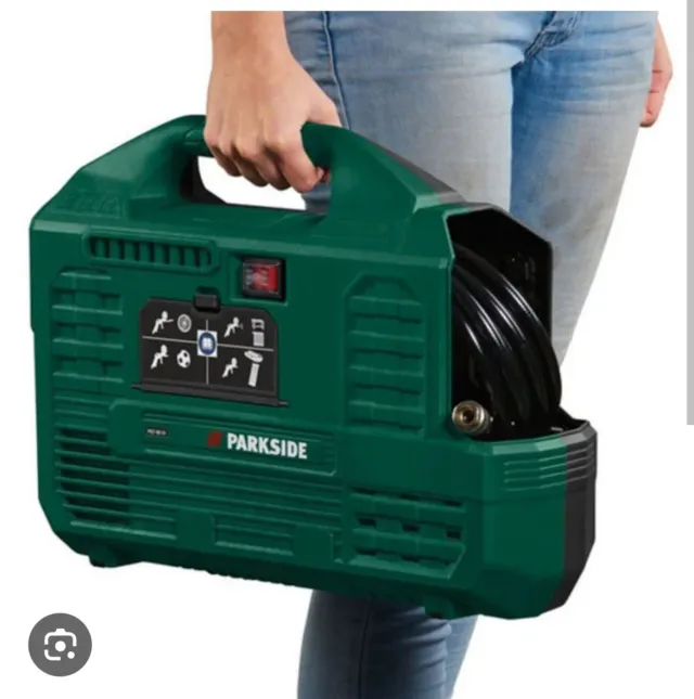Detalles del productoCompresor de aire de la marca Parkside. Diseñado para ser portátil y fácil de transportar.