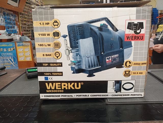 Detalles del productoCompresor portátil de la marca Werku, modelo WK500350. Ideal para diversas tareas.