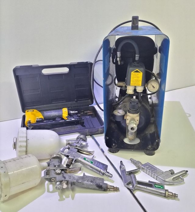 Compresor silencioso con accesorios. Incluye 2 pistolas de pintar, pistola de inflar y grapadora. - Se vende tal como se ve en las fotos.