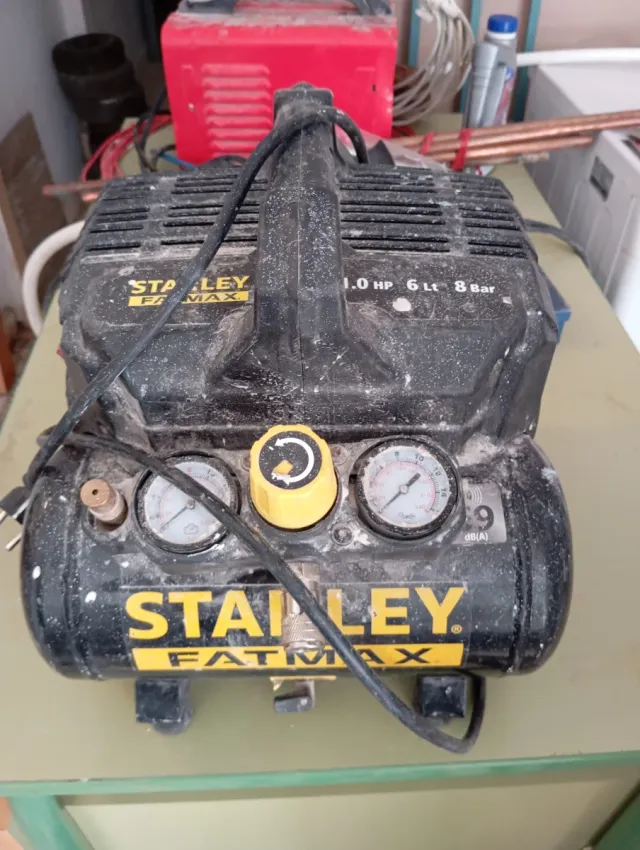 Detalles del productoCompresor de aire Stanley Fatmax con depósito de 6 litros y capacidad de 8 bares. En buen estado 100% Funcional