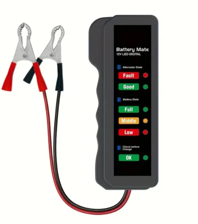 Detalles del productoComprobador digital LED para baterías de coche de 12V y alternadores. Permite verificar el estado de la batería y del alternador.