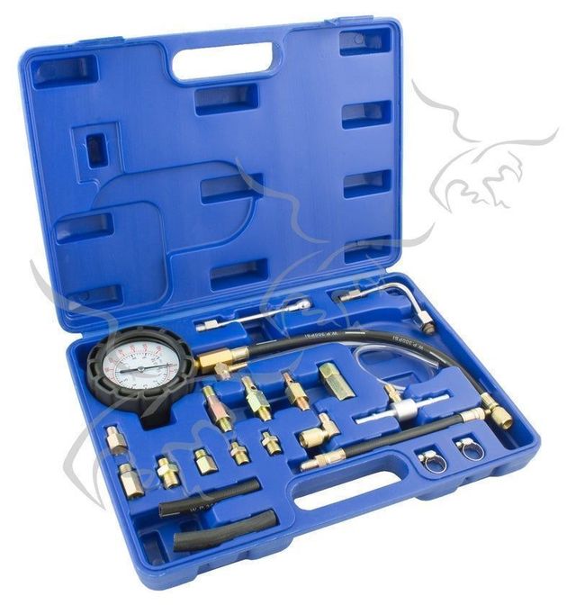 Tester para comprobar bomba de gasoil o gasolina. Incluye 1 manómetro con válvula para liberar la presión, mangueras de drenaje con acoples de rosca, adaptador en T, racores, adaptadores...