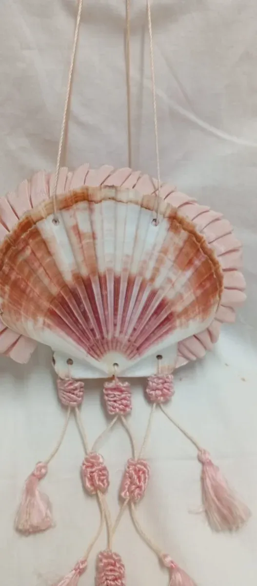 Detalles del productoPreciosa concha de Santiago decorada con un borde de flecos en color rosa y adornos colgantes con borlas.
