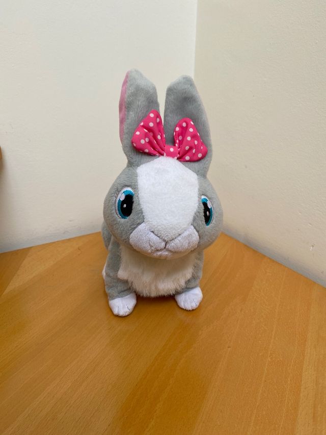 Conejita de peluche interactiva, de IMC toys, camina, mueve las orejas y hace varios sonidos. Mide 20cm x 25cm aprox. Pilas incluidas. Está nueva, casi sin uso.