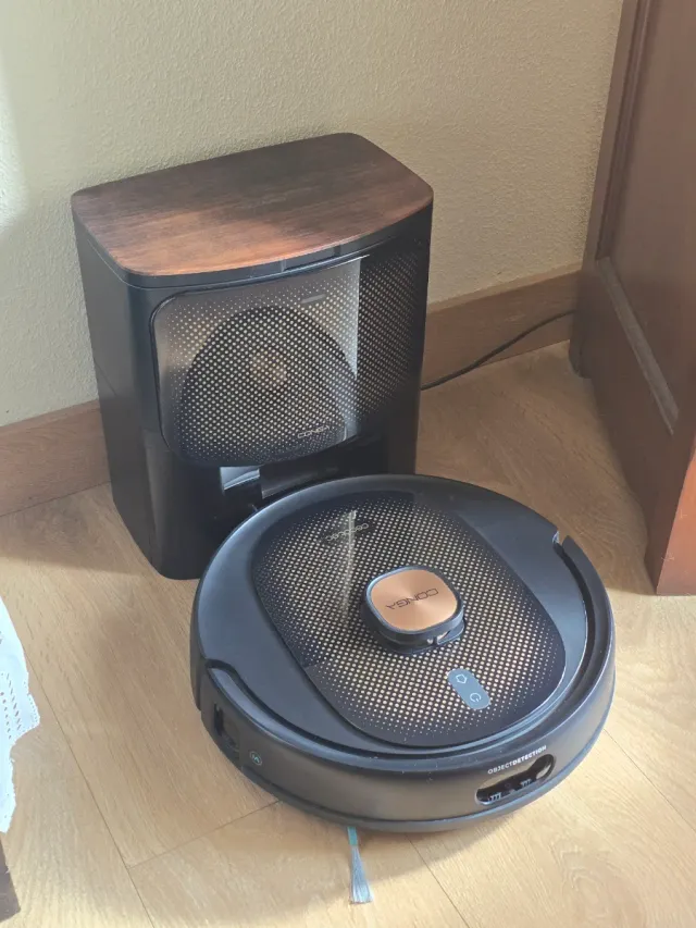 Detalles del productoVendo Robot Aspirador Conga 10090. Aspira y freiga. Con depósito de almacenaje de los residuos. La aspirador viene en colores marrones simulando madera en la tapa superior. Bastante elegante.