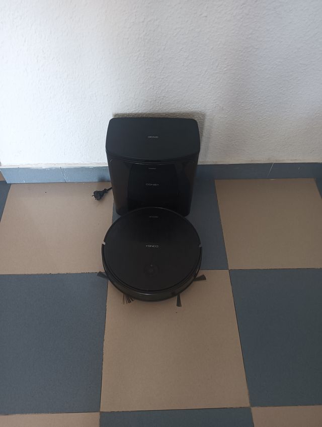 Detalles del productoAspiradora robot Conga 2499 en perfecto estado, junto con su base de autovaciado. Ambos dispositivos son de color negro.