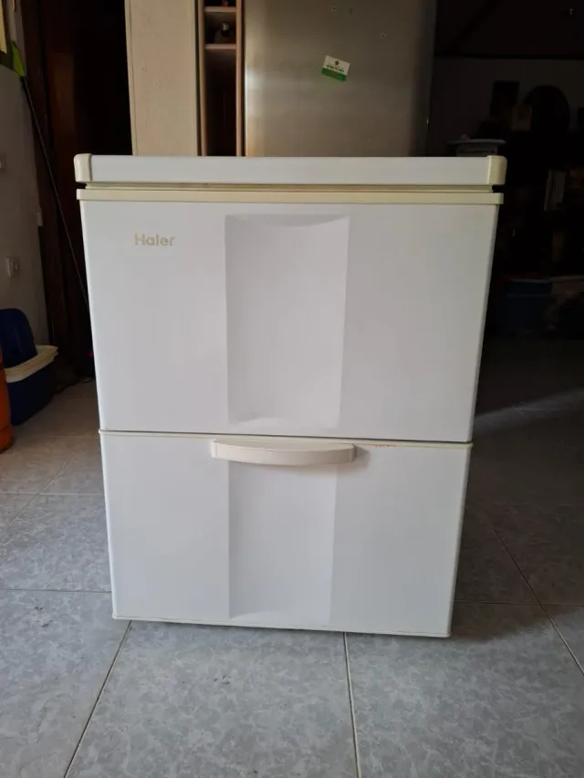 Detalles del productoCongelador vertical de la marca Haier en color blanco. Cuenta con dos compartimentos.