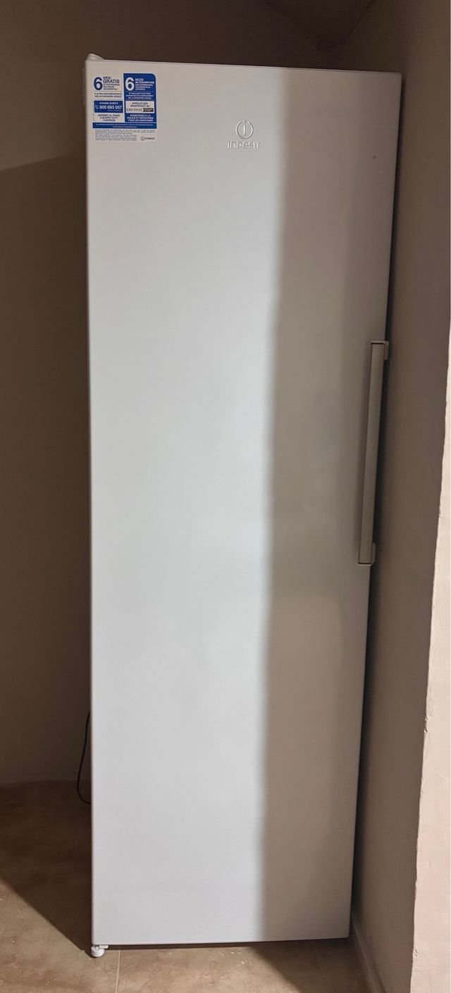 Congelador vertical de la marca Indesit en color blanco.