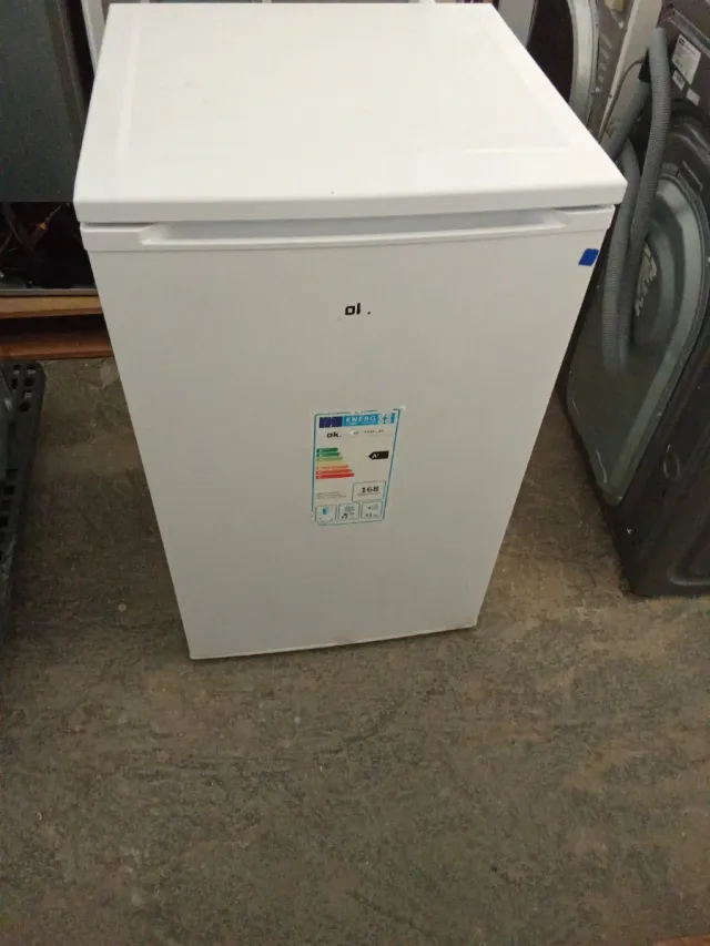 Congelador vertical de la marca OK. - Color blanco. - Etiqueta energética visible.