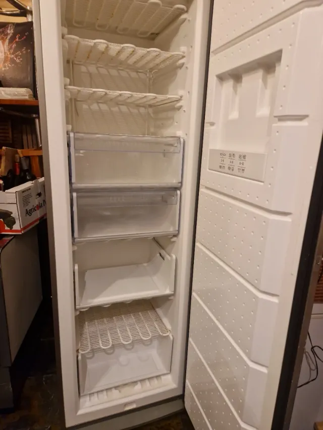 Congelador vertical con varios estantes. - Estantes de rejilla blanca. - Cajón transparente en la parte superior. - Puerta con compartimentos. Funciona perfecto