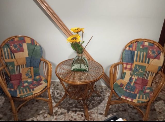 Detalles del productoConjunto de dos sillas y una mesa auxiliar de ratán con cojines.