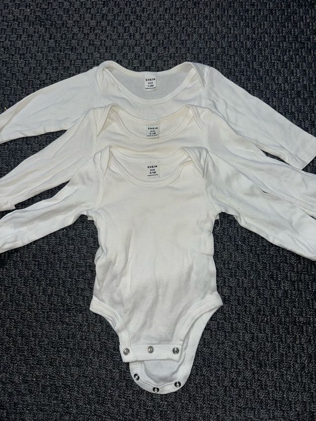 Conjunto de tres bodys blancos para bebé, ideales para el día a día. - Manga larga. - Cierre de broches en la parte inferior. - Talla 0-3 meses.