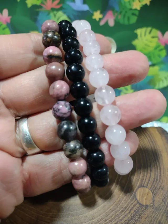 3 pulseras cuentas Rodonita, cuarzo rosa y Onix