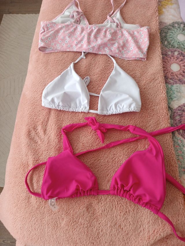 Conjunto de tres tops de bikini. - Top con estampado floral en rosa y blanco. - Top liso blanco. - Top liso fucsia.