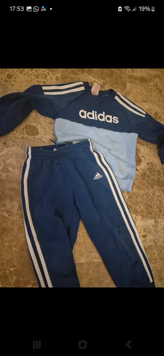 Conjunto deportivo Adidas para niño. - Sudadera azul con detalles en azul claro y logo. - Pantalón de chándal azul con franjas blancas laterales y logo.