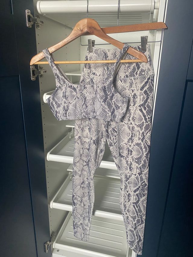 Detalles del productoConjunto deportivo de ALO Yoga con un llamativo estampado de serpiente. Incluye top talla M, y leggings talla S.