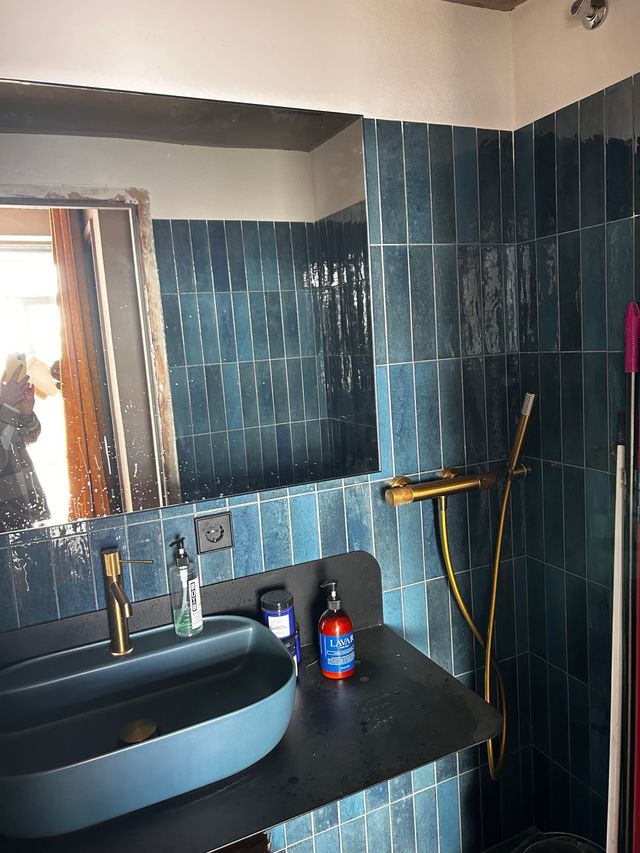 Incluye: pica azul + base negra metálica + espejo de 80x80 con perfil negro a juego, w.c. con mochila integrada + pulsador negro, griferia dorada (grifo, sifón y monomando de ducha).