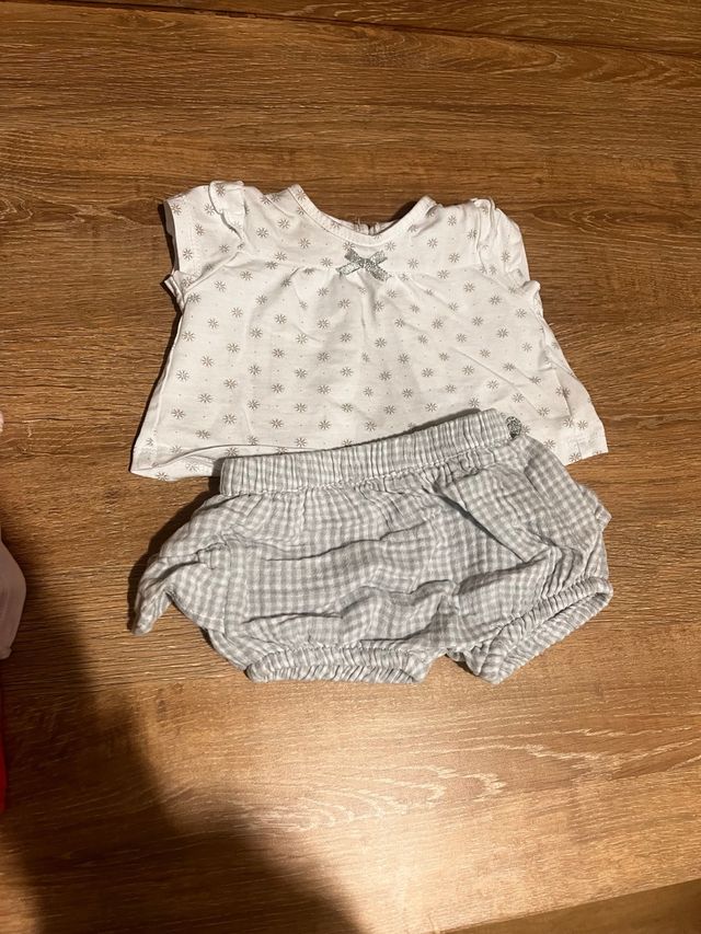 Conjunto de dos piezas para bebé. - Camiseta blanca con estampado de estrellas grises y lazo plateado. - Braguita de tela de cuadros grises. Para 1 mes. 55 cm. De la marca Yatsi Baby