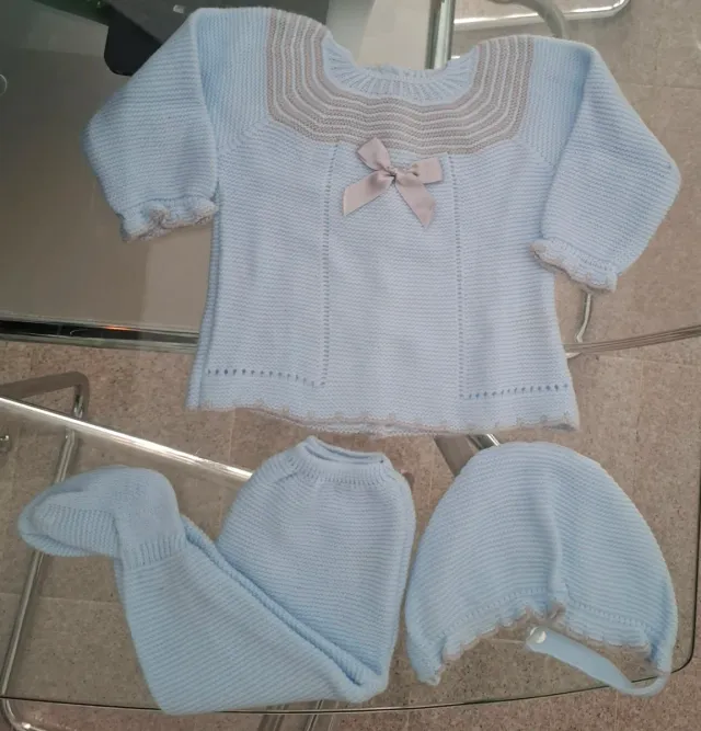 Conjunto de punto para bebé de 6 meses. - Color azul claro. - Incluye jersey, pantalón y gorrito. - Detalle de puntilla y lazo en el jersey.