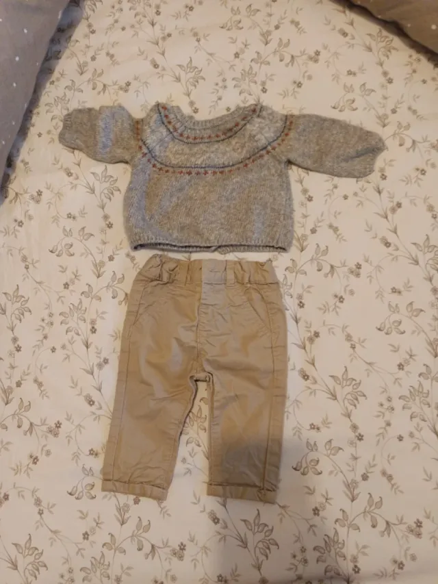 Conjunto de dos piezas para bebé, ideal para el día a día. - Jersey de punto gris con detalles de rombos en el cuello. - Pantalón tipo chino en color beige.