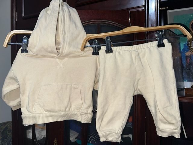 Detalles del productoConjunto de dos piezas para bebé, compuesto por sudadera con capucha y pantalón.