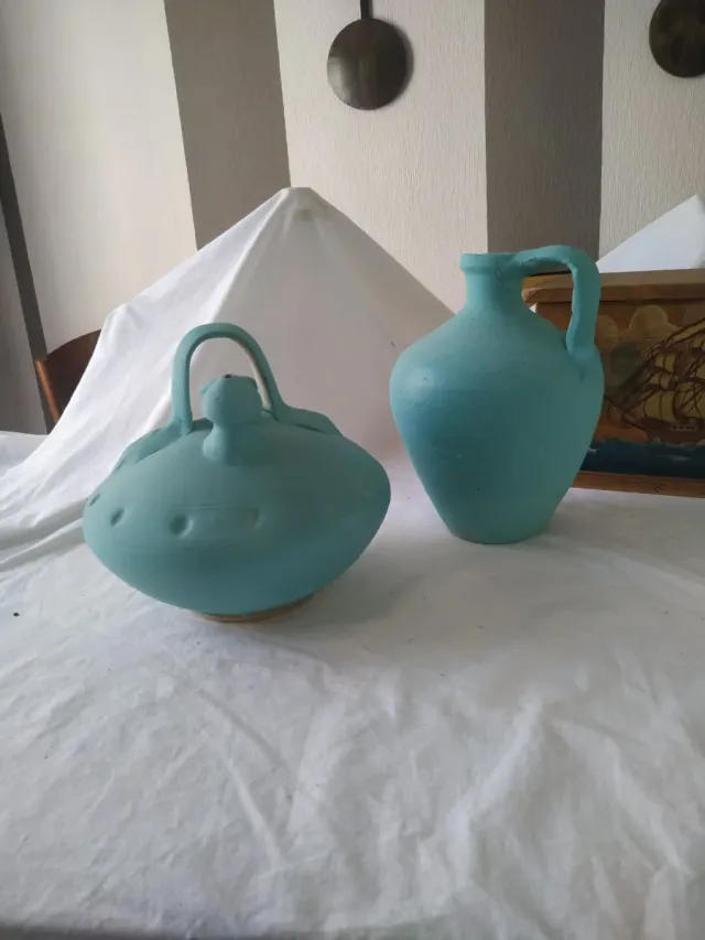 Detalles del productoConjunto de dos piezas de barro, un botijo y un cántaro.