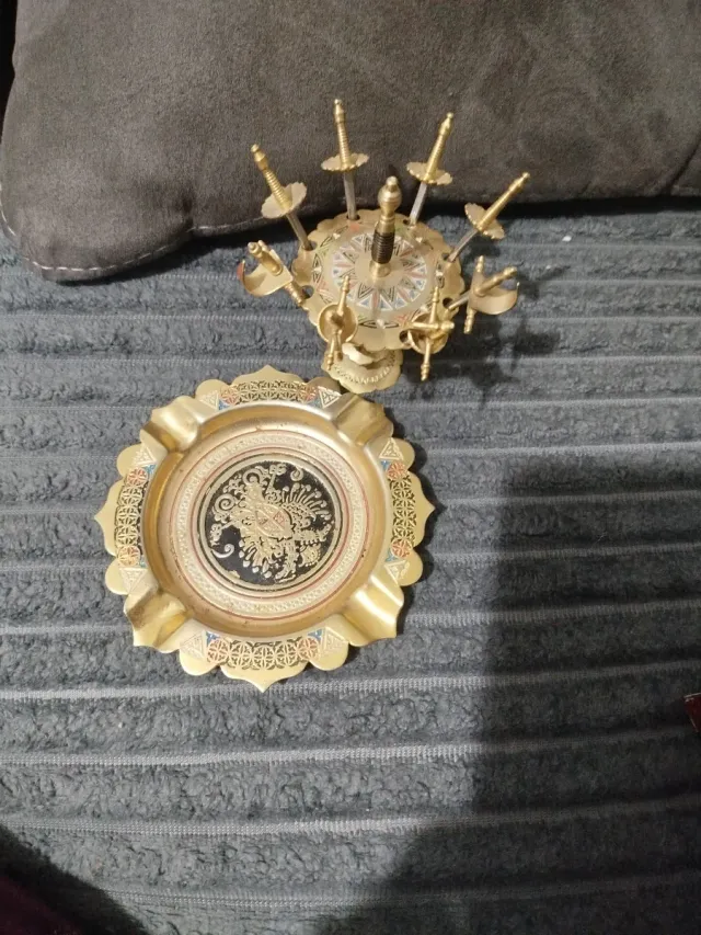 Detalles del productoConjunto decorativo antiguo compuesto por un cenicero y un palillero, ambos fabricados en Tole.