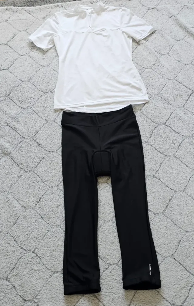 Detalles del productoConjunto de ropa para ciclismo compuesto por un maillot blanco y un culotte negro.