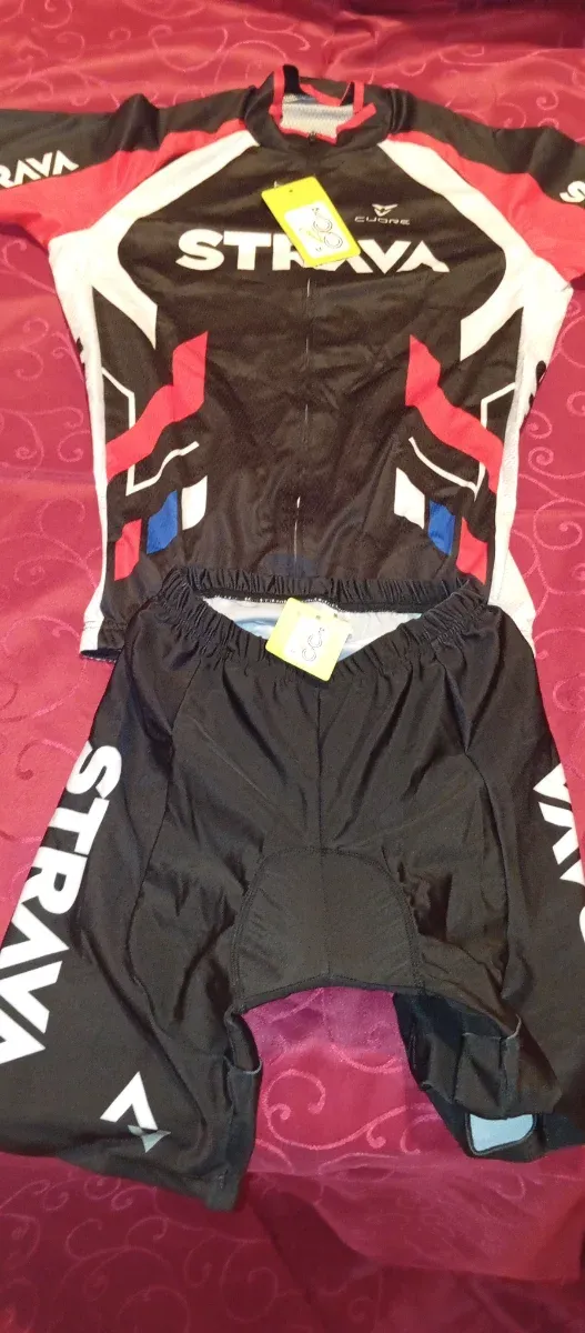 Detalles del productoConjunto de ciclismo de la marca Strava, compuesto por maillot y culotte.