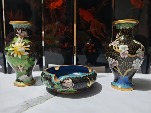Detalles del productoElegante conjunto de dos jarrones y un cenicero con la técnica cloisonné.