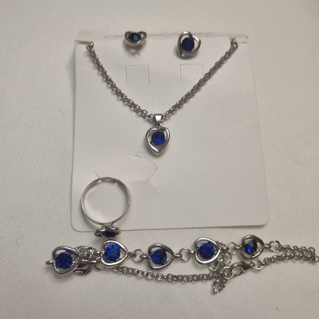 Detalles del productobonito conjunto en color plata forma de corazones cristal azul.