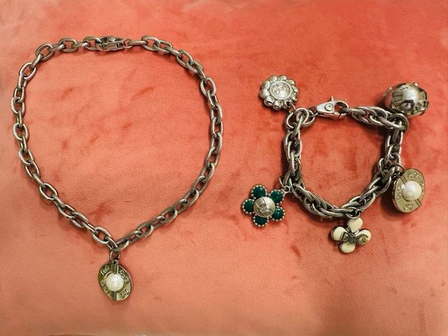 - Pulsera con varios dijes: una esfera, una flor verde, una flor blanca y un dije circular con perla.