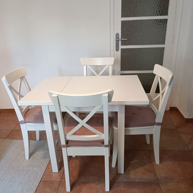 Detalles del productoVendo conjunto de comedor de Ikea, con mesa extensible para 4 personas, el modelo de la mesa es Pinntorp + las 4 sillas de madera del modelo Rosentorp en blanco, en excelente estado, con cojines rosados de regalo. La mesa Pinntorp es abatible/extensible para 2-4 comensales y mide 67/124 × 75 × 75 cm (L × F × H); estructura de madera, diseño tradicional que ahorra espacio. Cada silla Rosentorp (respaldo en cruz) mide 53 × 91 cm; asiento 44 × 39 cm, altura asiento 45 cm, probadas hasta 110 kg. PVP original aprox.: mesa 159