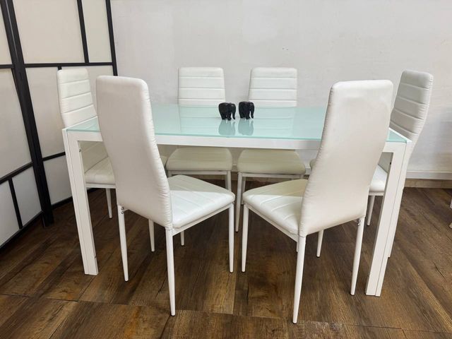 Vendo conjunto de mesa y 6 sillas de diseño. Mesa de cristal templado blanco y 6 sillas de polipiel. Elegancia y fácil limpieza. Mueble nuevo a estrenar. Palabras clave: Mesa, sillas, cristal, polipiel, moderno, nuevo.