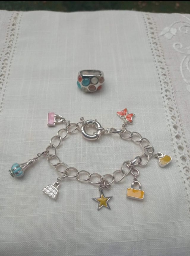 Un set elegante y moderno compuesto por dos piezas plateadas. El anillo es grueso y está decorado con piedras en distintas tonalidades. La pulsera cuenta con cierre de mosquetón grande, lo que facilita que una misma pueda ponérsela sin ayuda, y múltiples charms esmaltados. Estos colgantes también cuentan con cierre de mosquetón individual, por lo que se pueden quitar, poner y colocar como se desee, incluso colocarlos en otras piezas como cadenas, etc. Si te interesa alguna de las piezas por separado, vendo la pulsera a 2€ y el anillo a 1,50.