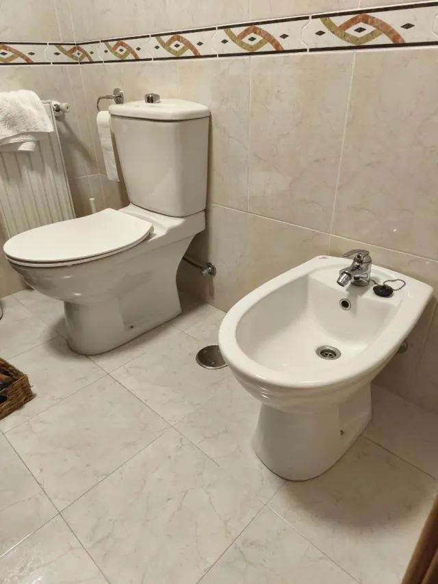 - Inodoro de cerámica blanca. - Bidé de cerámica blanca. - Diseño moderno y funcional.