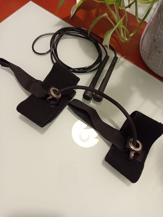 Conjunto de comba y bandas de resistencia para tobillos (se cierran con velcro). En muy buen estado, usado sólo 2 ó 3 veces.