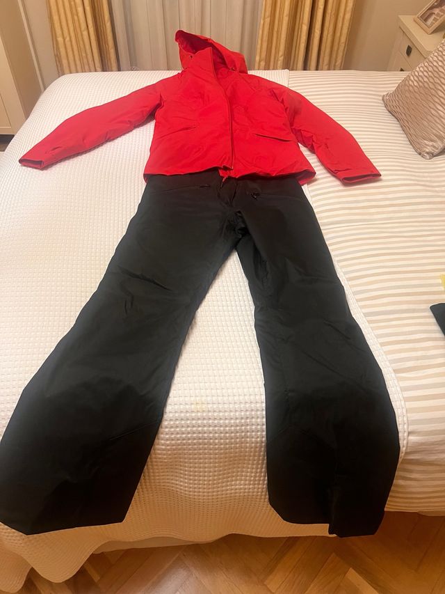 Conjunto de esquí para mujer, compuesto por chaqueta roja y pantalón negro. - Chaqueta con capucha - Pantalón de esquí Talla S Se ha puesto una vez