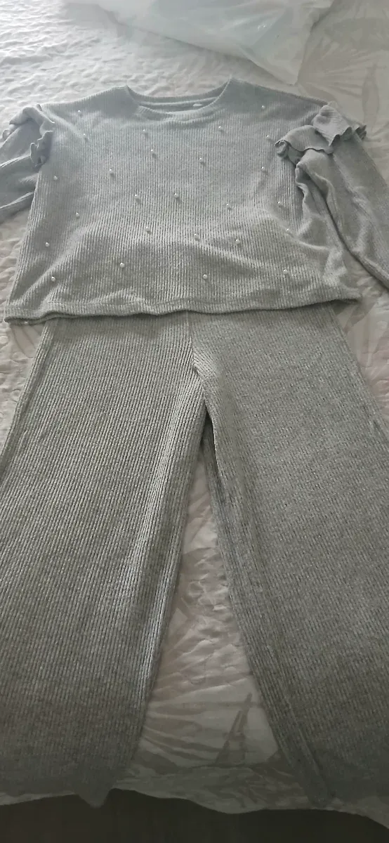 Detalles del productoConjunto de dos piezas de lana en color gris, adornado con perlas.
