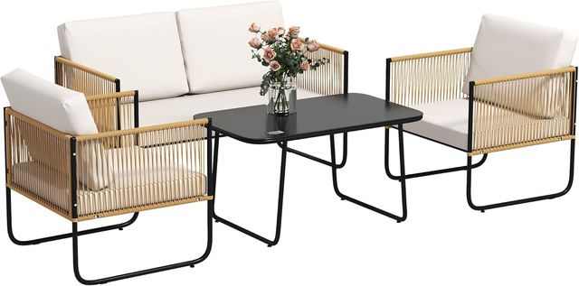 Detalles del productoCONJUNTO DE 4 PIEZAS: Incluye un sofá de 2 plazas, 2 sillones y una mesa rectangular para cenas al aire libre. MATERIALES: Estructura de acero negro pintado en polvo y ratán trenzado resistente a las inclemencias del tiempo. CONFORT: Cojines para el asiento y respaldo con relleno suave, extraíbles para una fácil limpieza. MESA: Tapa de vidrio templado, ideal para bebidas y aperitivos. DIMENSIONES: Sofá 110L x 61P x 63A cm, Sillón 56L x 61P x 63A cm, Mesa 80L x 50P x 43A cm. Capacidad: 240 kg (sofá), 120 kg (sillón). Montaje: 2 personas, 1 hora. Medidas del producto