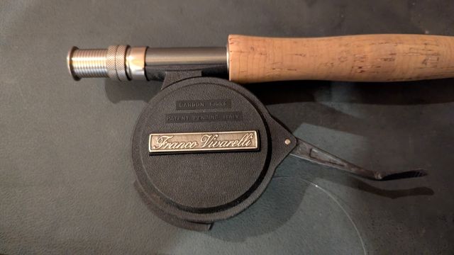 Carrete Franco Vivarelli con linea. Caña carbono Geológic titanium fly 700. Caja de moscas metal con aproximadamente 50 moscas entre secas, ninfas, etc...
