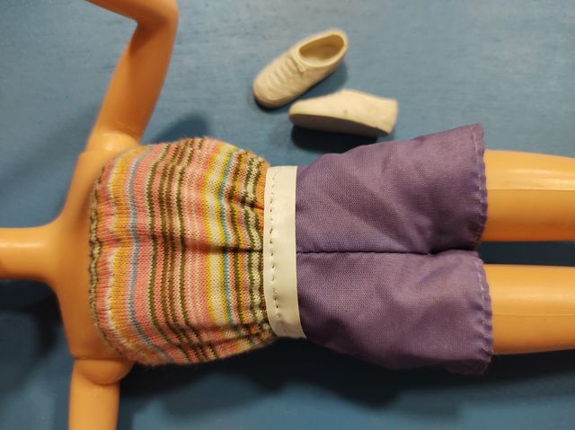 Detalles del productoConjunto deportivo de Barbie Congost consistente en un mono corto morado y a rayas y zapatillas deportivas blancas (una, rota por el talón, ver fotos)