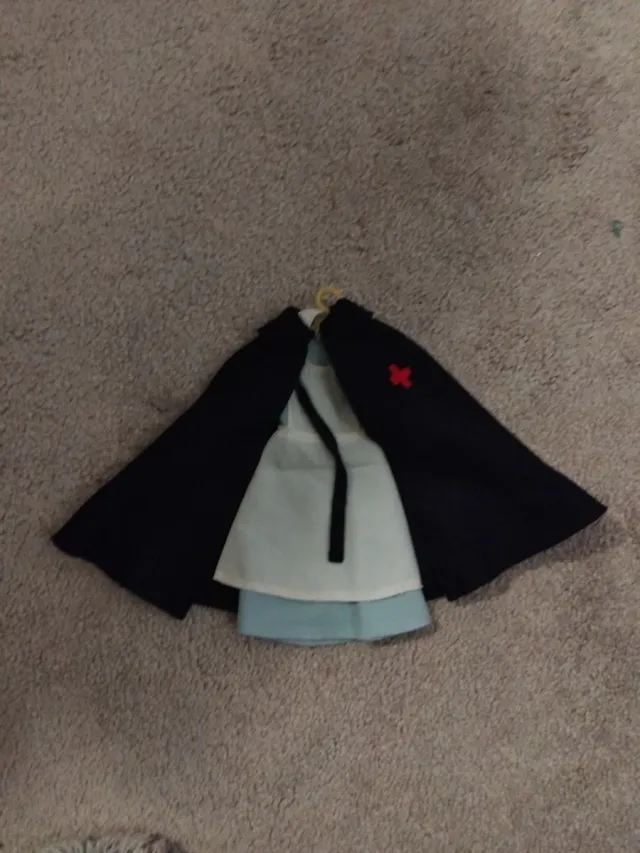 Conjunto de vestuario para muñeca Lesly, ideal para recrear escenas de enfermería. - Capa con detalle de cruz roja. - Vestido azul. - delantal blanco