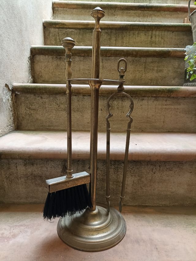 Conjunto de enseres de chimenea vintage Muy antiguos, de los años 40 Material latón sin uso