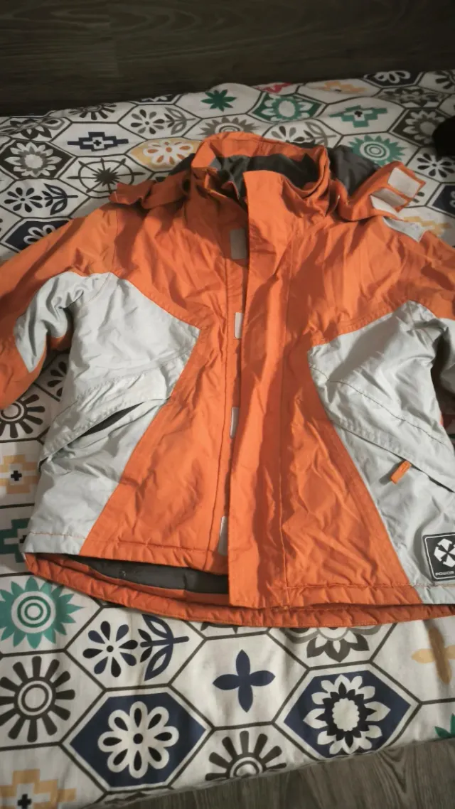 Detalles del productoConjunto de esquí para niños en tonos naranja y gris. Ideal para disfrutar de la nieve con comodidad.