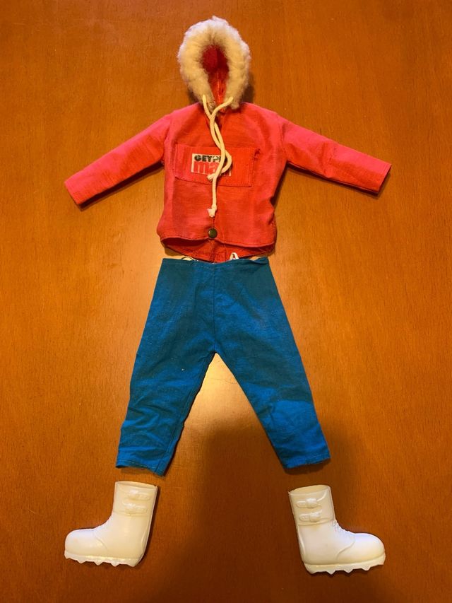 Conjunto de ropa para muñeco Geyperman. - Chaqueta roja con capucha y pelo sintético. - Pantalón azul. - Botas blancas.