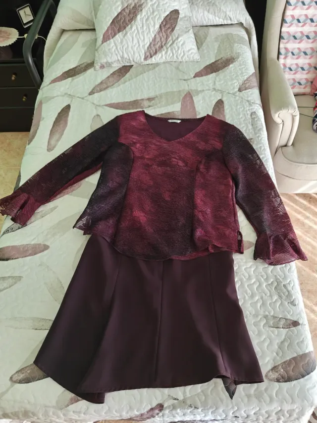 Conjunto de falda y blusa en tono burdeos. - Blusa con mangas largas de tejido semitransparente. - Falda de corte evasé.