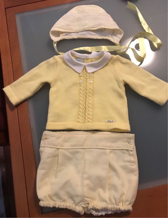 Detalles del productoSe vende conjunto de punto amarillo talla cero meses y capota talla 1 mes de la marca Foque, muy buena calidad y cómodo, sólo usado muy poco para bebé Reborn, pongo fotos para ver cómo queda, EL REBORN NO SE INCLUYE.