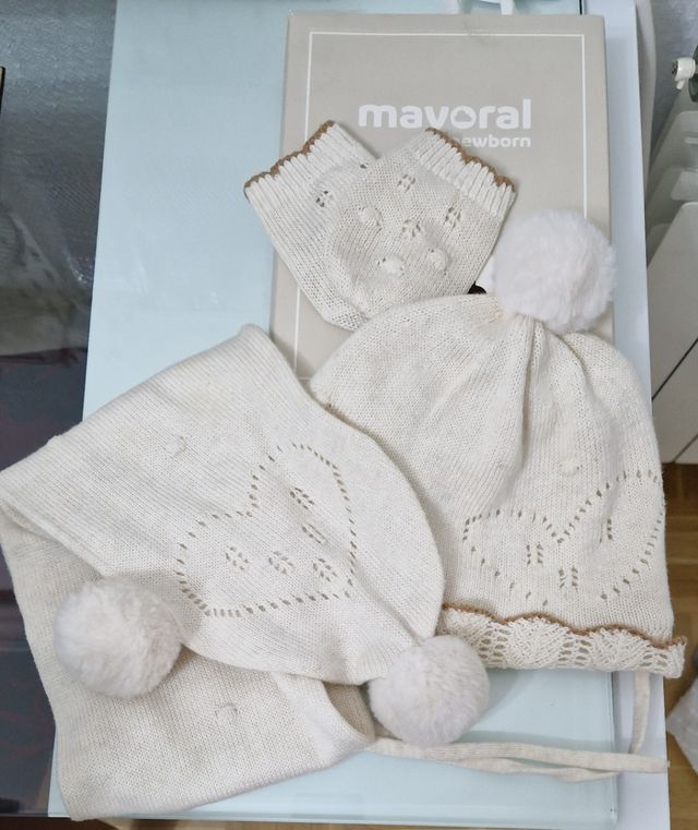 Conjunto gorro bufanda y manoplas Mayoral talla 18 meses. Color beige. Sólo envios